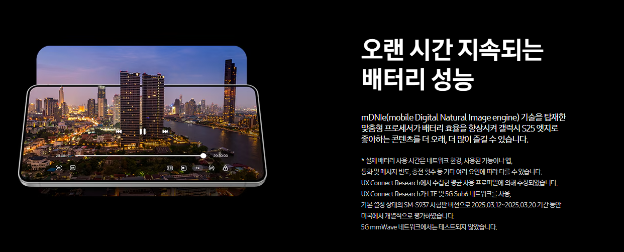 강력한 배터리는 갤럭시 S25 엣지의 중요한 특징 중 하나입니다. 하루 종일 사용할 수 있는 긴 사용 시간을 제공하며, 빠른 충전과 무선 충전도 지원합니다. 45W 급속 충전 기능을 통해 약 30분 만에 50% 이상 충전할 수 있습니다.