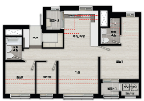 - 특징: 가스쿡탑 3구, 알파룸 분리공간 시공, 강화합판마루 시공