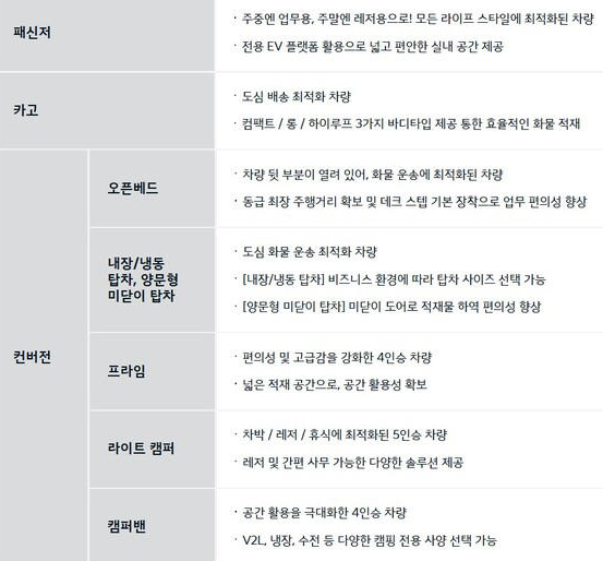 - 특히, B2B 고객을 위한 커스터마이징 기능이 강화되어, 냉장 밴, 이동식 사무실, 모빌리티 병원, 푸드트럭 등 다양한 버전으로 파생이 가능합니다.
