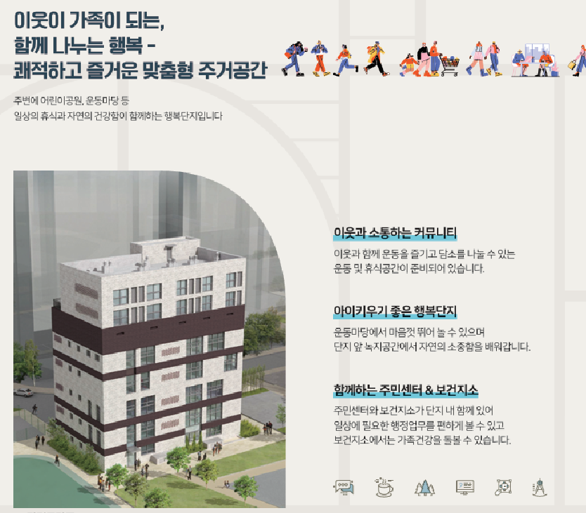 • 건물구성: 1층 주민센터, 2~3층 보건지소, 4~5층 데이케어센터, 6~7층이 주거공간